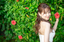 ブーケで口もとを隠した新婦様のソロショット。目元だけでも幸せな雰囲気が伝わってきます