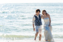 お衣装を着たまま入る海は、一段と爽快!!おふたりで水しぶきをあげたショットがとっても楽しそう。