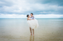 ドレス、タキシードでビーチへウォーターイン 上空からドローン撮影