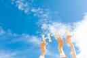 手と手を重ねあわせ、指輪をアピール❤︎ブーケがあることで、より華やかに。