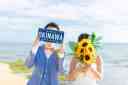 小物を持つことで、雰囲気がガラリと変わります!真っ青な海をバックに、帽子をもつご新郎様。旅の象徴ですねー