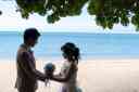 キラキラなビーチをバックに、おでこ同士を合わせる仲良しなおふたり♡