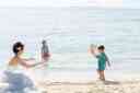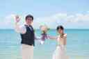 沖縄のビーチを満喫しているおふたり!最後はピースで締めくくり
