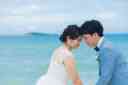 砂浜を歩くおふたりを引きで撮影。引きだからこそ、沖縄のビーチの雰囲気を味わえる