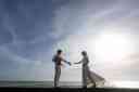 手を繋ぎながら砂浜を歩く一枚♪海が綺麗すぎて、見惚れている・・?