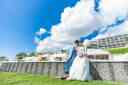 ベールをなびかせて にこやかな笑みを浮かべるご新婦様のソロショット