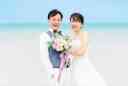 海をバックに撮影 おでことおでこを合わせて密着しながらの撮影