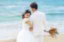 ビーチで密着 青く綺麗な海がおふたりの撮影をさらに盛り上げる材料に