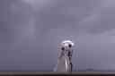 イニシャルオブジェを空に向かって投げる 青い背景にマッチする