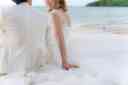ビーチで手を繋いで並ぶおふたり 遠くの景色を見つめながら