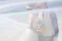 イニシャルオブジェを頭上に掲げて きれいな海を見つめながら
