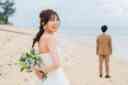 沖縄らしい映える小物と華やかなブーケを手にもち 撮影を