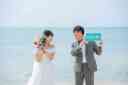 楽しそうにポージングをとるおふたり 沖縄のビーチが一望できる1枚に