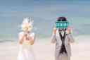 透き通るような青いビーチを目の前に ジャンプするおふたり