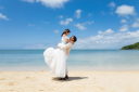 青い海、青い空を背景に撮影スタート!!手をつないで立つだけで絵になっています。
