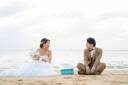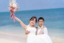 お揃いの帽子で仲良しショット 背景に映るビーチの青色も白が基調のおふたりの味方としていい味を出している