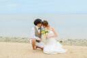 ビーチをバックに、笑顔のおふたり すでにリラックスモードに