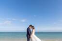 おふたりの後ろ姿ショット 目の前には美しく透き通る海がそこに