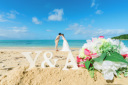 ブーケで顔を隠して可愛らしい一枚♪ 後ろの透き通った海に可愛いブーケでさらに映えさせてくれます☆