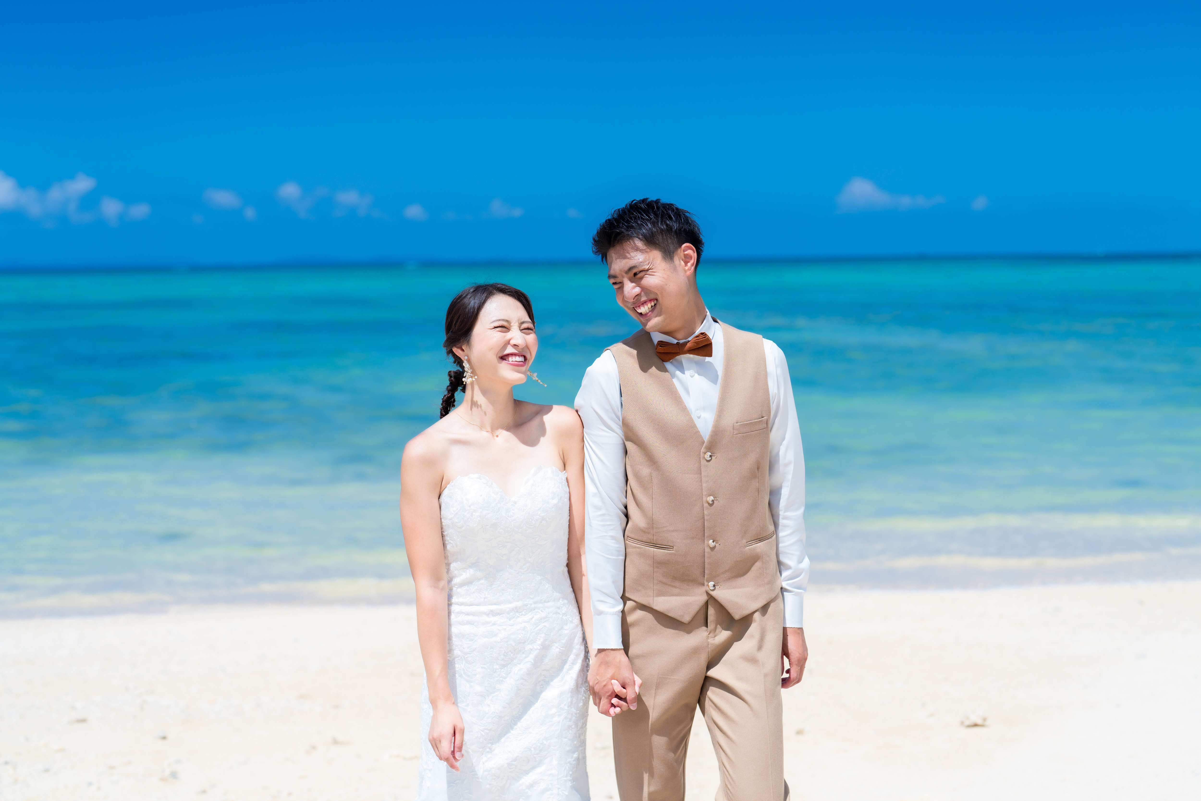 沖縄の1番の魅力は青く美しい海!人通りが少ない穴場のビーチにご案内するので、周りの人を気にせず撮影ができます◎青い海をバックに撮影したり、ビーチ沿いを歩いていただき自然なおふたりの姿も写真に。