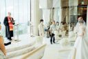 大きな窓から広がる沖縄の海を背景に、おふたりが誓いのキス。ドラマチックな瞬間が訪れます。自然光に包まれた祭壇が、おふたりの誓いをさらに美しく演出します。