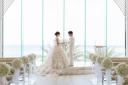 祭壇に並ぶおふたり♡沖縄らしい青い海と空からの光がおふたりを優しく照らします。サテン生地の上品なお衣裳がチャペルの雰囲気にもぴったりで、素敵な一枚となっています