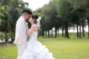 緑豊かな公園の中で、お互いを見つめ合うおふたり。ドレスとスーツが映える中、幸せに満ちた表情が印象的ですね。これからの人生をともに歩んでいくふたりの特別な瞬間☆彡