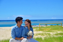 お2人らしいとびっきりの笑顔!沖縄の美しい海をバックにとっても輝いています!