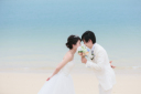美しい空と雲、海、砂浜の中で、憧れのお姫様抱っこ!艶のある素材のドレスにカラータキシードというお二人の衣装の組み合わせもお姫様感を後押ししています!