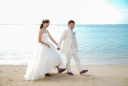 新郎様が新婦様の手を取り、優しくエスコートしながらいざビーチへ!振り返る2人の向こうには海と空がどこまでも広がります。ドレスのトレーンの広がりも美しいです。
