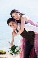 木に座ってのお撮影♪自然溢れるビーチでバックスタイルも!太陽にキラキラと照らされるお二人。目の前に広がる海を二人占め♪