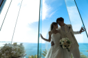一面ガラスからキラキラと自然光が降り注ぎます。バックには沖縄の輝く海が(*^^*)お二人のポージングも素敵で、まるでモデルのようです。