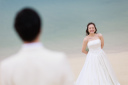 お次は、青い海と空、真っ白な砂浜で撮影。新郎様はデニムのタキシードに衣裳チェンジ♪カジュアルな雰囲気がビーチと合いますね!
