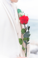 赤と白のお花が使用されたブーケとドレスを合わせたコーディネートで大人の女性を演出♡