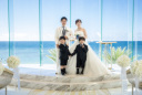 お二人の愛を示す誓いのキス。チャペルガラスから見える青い海も素敵です。