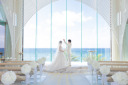青い海をバックに白いベールをなびかせ、寄り添うおふたり♪