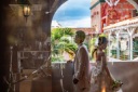 ウェディングドレスとベールの風になびかせる姿がとても美しいショットです!