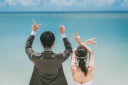爽やかブルーのタキシードに蝶ネクタイでカジュアルな装いがリゾートウェディングらしいですね♪