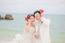 無邪気な一面を見せる新郎様♪沖縄の綺麗な青い空、青い海がバックに明るい光がお二人を照らします