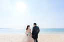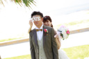 チャペルを出てすぐの所にあるアメリカンビレッジでの撮影!おふたりブルーの衣装がとても似合っています!