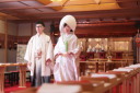 人気の館内フォトスポットで、番傘ショットを。花嫁様の白無垢がとても映えます。