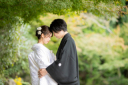 アーチ状の橋の上、和傘をさしてお二人の全身ポーズも
