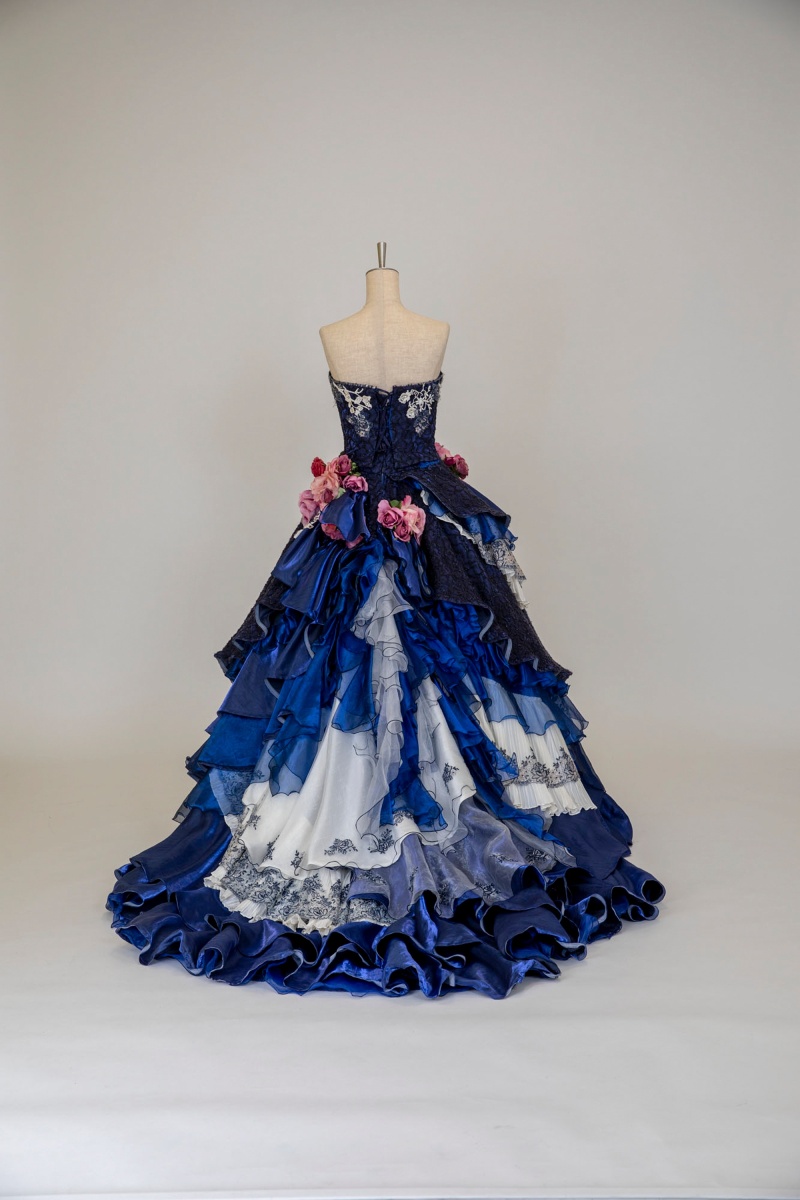 ネイビーとブルーのグラデーションのフリルが重なり、ポイントに白のケミカルレースをあしらい上品な印象もある大人可愛いデザイン。