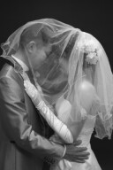 総レースのドレスにはブラウスとドライブーケを合わせておしゃれで上品に。タキシードもシャンパンゴールドでクラシカルかつ落ち着いた雰囲気に。