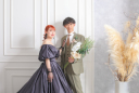 スタジオでイサムモリタのドレスに着替えて、ドライフラワーの部屋で撮影です。幻想的なお写真にスタッフも素敵と喜んだショットに(^^♪