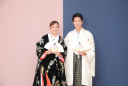 ネイビーとピンクの背景でお二人の柔らかい表情を引き立てます。