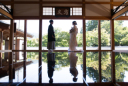 木々の色並みのグラデーションとダイナミックな風景と和装姿が印象的です。