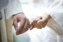 風に吹かれたベール越しのおふたり♡ブーケも指輪もヘアアレンジも、こだわりが写る1枚!