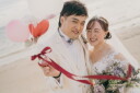 新婦様はモスグリーンのお袖がフリフリで可愛いカラードレスに、新郎様はホワイトタキシードでさわやかに!お衣装チェンジをしてビーチで撮影されましたよ♡