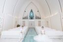 クリスタルブルーのバージンロードを進みます。ステンドグラスも収めたチャペル空間です。